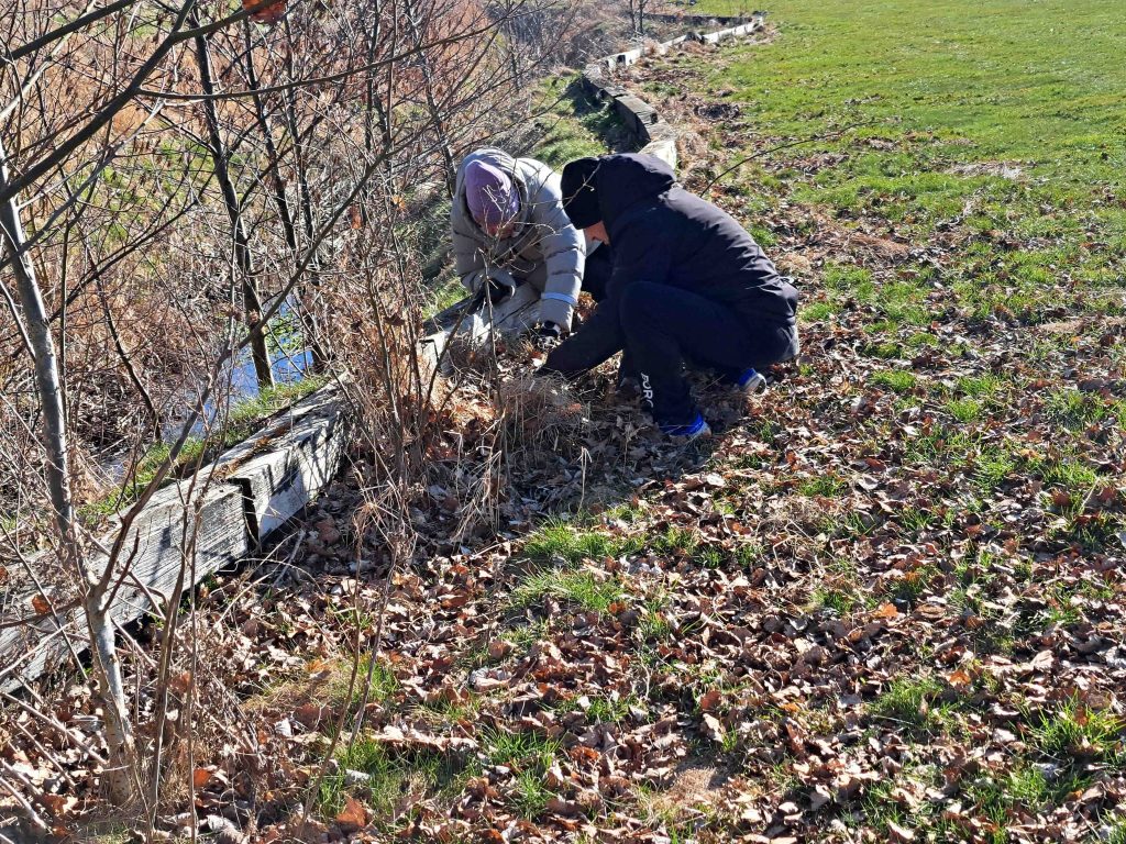 Blev stolper ved åen fritlagt for græs med en buskrydder.